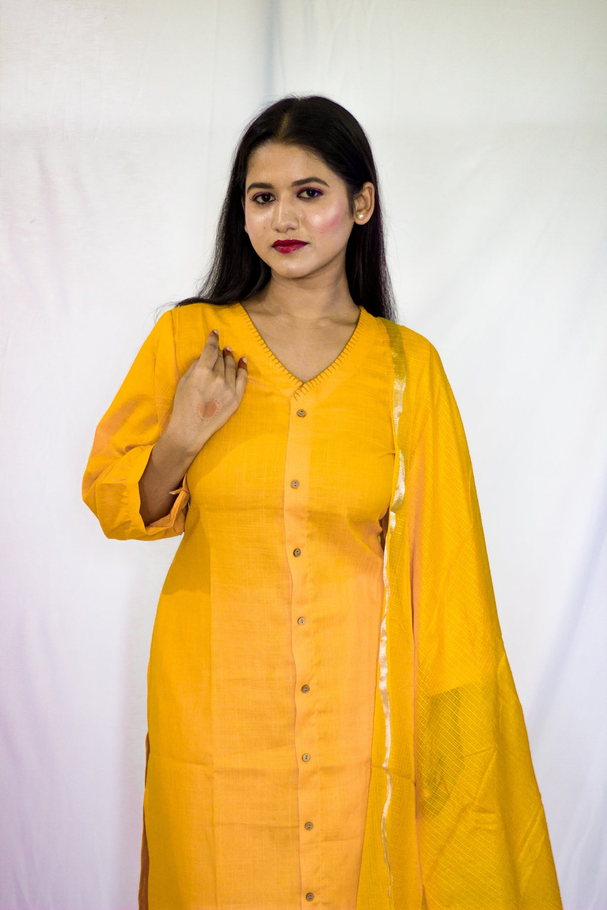 Refresh your ethnic collection with this graceful 3-piece set in a soothing Yellow shade. Crafted from breathable linen, the ensemble strikes the perfect balance between comfort and elegance, making it ideal for daily wear as well as festive occasions.